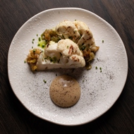 When serving on a plate, arrange the cauliflower, place the caramelized leeks alongside, and add a generous spoonful of miso sauce.