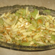 Remove the leaves from the celery and chop them roughly. Cut the stems diagonally into long, thin ovals.