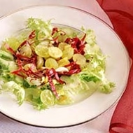 Wash the frisée lettuce, chop it, and place it in a salad bowl. Wash the radicchio and cut it into strips. Place it in the center of the salad. Cut the celery into cubes. Wash the grapes, cut them in half, and remove the seeds. Add the celery and grapes on top of the radicchio.
