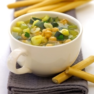 Strain the finished broth, pour it into soup bowls, and serve with croutons or pastries.