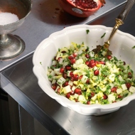 Remove the seeds from the pomegranate — the easiest and most effective way to do this is by submerging the halved pomegranate in ice-cold water. This way, you won't splatter yourself with the difficult-to-clean pomegranate juice, and the seeds will remain intact and taste fresher in the cold water. Add the seeds to the salad and grind some black pepper over it.