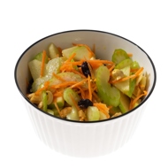 Place the vegetables and apple in a bowl, add raisins and cashews.