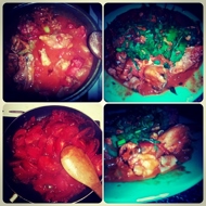 Check the amount of liquid in the pot — add a little water so that the chicken and vegetables are not overly exposed. But do not drown them! Chakhokhbili is not a soup!