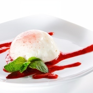 When serving, garnish the cream with mint leaves and raspberries.