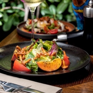 Arrange the tomatoes on a plate, tear the washed and dried salad leaves by hand (if they are large) and place them on top of the tomatoes. Scatter the peach slices around the plate, and add the mushrooms with onions on top of the salad (remove the garlic and thyme from them).