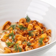 The dish is crafted almost like a cocktail formula, beloved by a fictional secret agent — 'shaken, not stirred.' Boiled potatoes are mashed and blended with rich meat broth and cream until they reach a glossy cream consistency. The chanterelles are sautéed separately and sprinkled on top, resembling golden popcorn. The presentation of the plate evokes some pastry associations, but a generous dose of dill brings you back to reality. Recipe provided by a popular American restaurant delivery service.