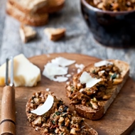 Preheat the oven to the lowest temperature and warm the bread in it. Spend a few minutes thoroughly cleaning the mushrooms from dirt, grass, and small bugs that may be hiding under the caps. Set aside a few parsley leaves and finely chop the rest along with the stems.