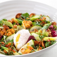 Combine mixed salad, thinly sliced zucchini, asparagus, and chanterelles in a serving dish. Dress with sauce and top with a poached egg.