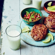Heat some oil in a large skillet. Fry the patties in batches for a couple of minutes on each side, until golden brown and cooked to your desired doneness. Serve with lime wedges, flatbreads, and a tomato-pomegranate relish.
