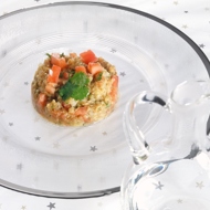 Peel the onion, finely chop it, and rinse it under cold water. On a large cutting board, combine the eggplant flesh, tomatoes, onion, and garlic, and chop everything together with a heavy knife until the ingredients are evenly mixed — but not pureed.