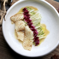 Assemble the dish: place the guacamole on a plate. Drain the apple slices in a sieve, then arrange the apple strips on top of the guacamole. Layer the squid on top and garnish with pickled chrysanthemum petals.