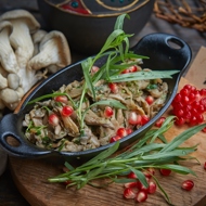 Before serving, sprinkle with pomegranate seeds and tarragon leaves.