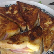 Place cheese and ham on one slice of bread, then cover with another slice of bread. Cut the resulting sandwich in half to make two triangles.