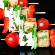 Take long skewers or wooden sticks for kebabs. Alternate threading the vegetables: pepper, bread (previously dipped in the marinade), fold the zucchini like an accordion and thread it, mozzarella cube (carefully remove it from the marinade), and finish with a cherry tomato.
