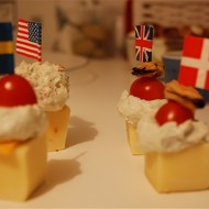 Place the cheese balls on the Edam cubes, then top with cherry tomatoes and mussels.