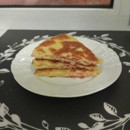 Divide the prepared dough into small balls, roll out each ball into a small flatbread (you can fry it as is), and add the filling (I used ham). You can also use a different type of cheese, which is delicious as well. Let your creativity shine! Seal the edges and roll it out slightly.