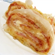In this roll, in addition to vegetable filling, there can also be a meat filling made from ham or sausage, and for a spicy kick, you can add a bit of pesto instead of yogurt to the sauce. Do not roll the roll too tightly, or the filling will fall out.