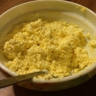 Grate the cheese on a fine grater and press a couple of cloves of garlic through a garlic press.