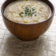 Pour broth over the sautéed vegetables and bring to a boil. Add the potatoes and cook for 5 minutes. Blend the soup in a blender.