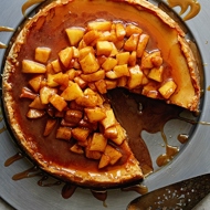 When serving, drizzle the cheesecake with caramel sauce. Optionally, you can garnish with mini apples and nuts.