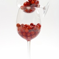 While the wine is steeping, cut the large sweet cherries (or dark sweet cherries) in half and remove the pits.