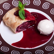 It is very good to serve the strudel with a berry sauce made from cherry juice. Bring the cherry juice, berries, and sugar to a boil, add cornstarch diluted in 3 tablespoons of water, and stir until thickened. After the sauce cools, drizzle it over the strudel and serve.