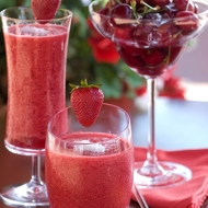 In a blender, combine half of the cherries, strawberries, and juice. Blend until smooth and pour into glasses.