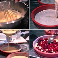 Grease the bottom of the baking dish with butter and dust it with flour. Gently tap the dish on the table a few times to remove any unwanted air.