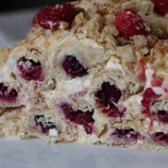 On each strip, place the cherries (by this time, the berries should have drained). Leave a few strips without filling – for decorating the cake.