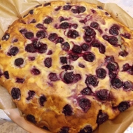 Place pitted cherries (frozen cherries can be used, but they should be thawed beforehand) on top, gently pressing them into the batter.