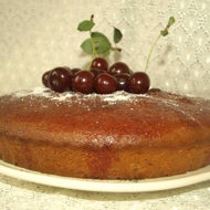 Remove from the mold and transfer to a plate. Decorate with powdered sugar and fresh cherries.