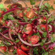 Combine the tomatoes, onion, pomegranate seeds, and herbs in a clear salad bowl.