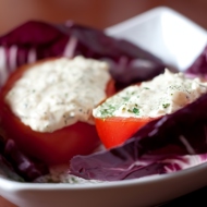 Cut the feta into small cubes and mix with olive oil, finely chopped shallot, and oregano. Season with salt and pepper.