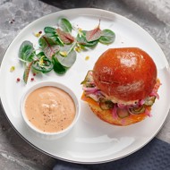 Transfer the sauce to a separate container. Serve the burger with iceberg and lettuce leaves and the sauce.