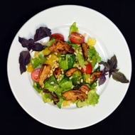 Arrange the salad greens with peaches on a plate, and top with the tomatoes and slices of chicken.
