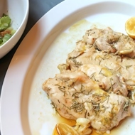 Pour the broth or wine and lemon juice into the dish. Turn off the oven, but let the chicken sit in there for about 5 minutes.