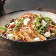 Place the salad mix, grapes, chicken fillet, and onion in a salad bowl, drizzle with the dressing, and toss. Sprinkle with crumbled feta cheese and walnuts, and serve.