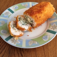Place the filling in the center of the pounded breast and roll it up: if possible, into an envelope, if not, into a roll. Don't overdo it: the overlap (meat on meat) should not be more than 2 cm, otherwise the meat won't cook through. Secure with toothpicks, trimming the ends (leave only about 2-3 mm).