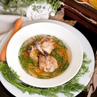 Remove the chicken drumsticks from the broth and peel off the skin. Add the potato and carrot to the broth, cook until ready for 5–7 minutes, and at the end add the spinach. Place the cooked omelet at the bottom of the soup bowl and pour in the soup. Top with 2 chicken drumsticks.
