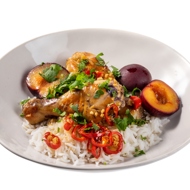 Cut the plums in half and remove the pits. Take the baking tray out again, place the plums on it, and return it to the oven for another fifteen minutes. Serve the cooked drumsticks with mashed potatoes or plain boiled rice, according to your preference. Garnish with chopped cilantro.