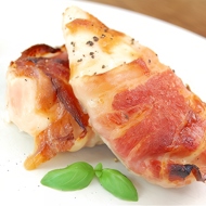 Remove the cheese sausage from the refrigerator, unwrap it, and cut it into 4 pieces. Place one piece on each chicken breast and fold them into envelopes. Wrap each envelope in 2 thin slices of bacon and secure with toothpicks.