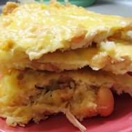 Spread the potato puree in a deep skillet, add a layer of chicken meat, and beans on top. Brush with whipped egg whites, sprinkle with grated cheese, and place in the oven. Bake until a golden crust forms.