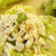 Finely chop the boiled chicken fillet, boiled champignon mushrooms, pickles, and celery root.