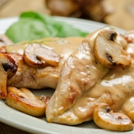 Meanwhile, prepare the sauce. Slice the mushrooms and sauté them in oil until the liquid evaporates. Finally, add the sour cream, simmer for a couple of minutes, and remove from the skillet.