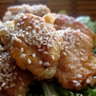 Prepare the sauce. All ingredients should be prepped and placed next to the stove. Heat sesame oil in a pan, add garlic and ginger, and sauté for about 30 seconds. Add honey, salt, vinegar, and water, and stir. Pour in the cornstarch dissolved in water and cook for about 2 minutes, stirring.