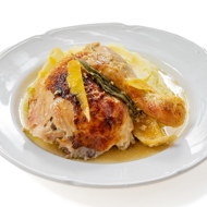 In the same container, melt the remaining butter and return the chicken to it. Arrange the garlic around the chicken.