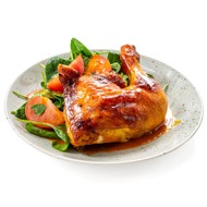 Serve the cooked chicken with salad, drizzled with sea buckthorn sauce.