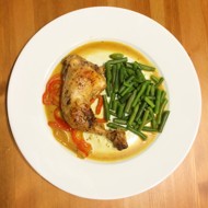 Heat canola oil over medium-high heat and sauté the skinless chicken thighs until golden brown for about eight minutes, turning them once during cooking.