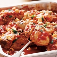 Pour the chickpea and vegetable mixture over the chicken drumsticks and thighs, season with salt and pepper to taste, and bake in a preheated oven at 392°F until the chicken is cooked through. It's best to cover the dish with foil to prevent drying out.