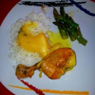 Add the chicken legs to the sauce and simmer for 15-20 minutes. Add the mint leaves 5 minutes before finishing. Serve with rice and vegetables.